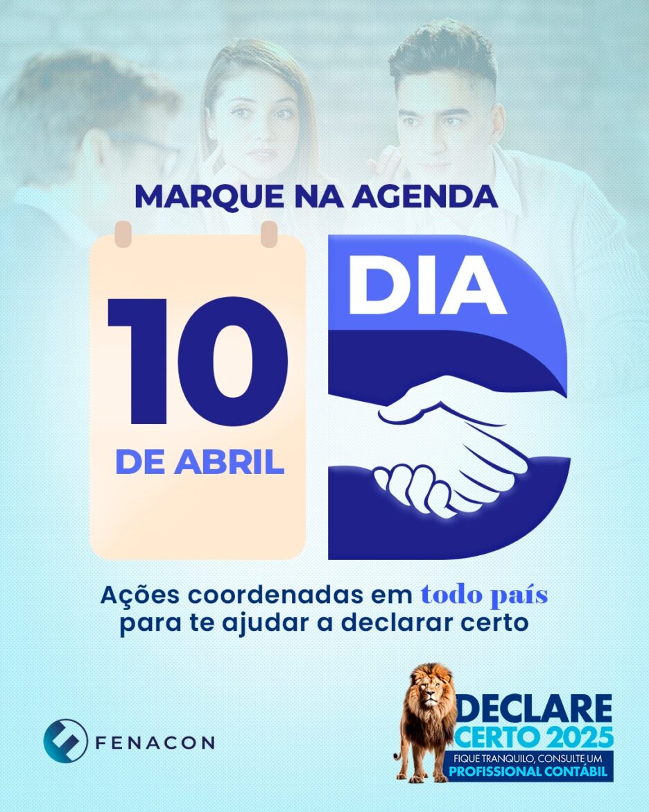 10 de abril foi escolhido como o Dia D de atendimento da campanha Declare Certo. A iniciativa da FENACON mobiliza os Sescons, Sescaps e Sinescontábil de todo o país numa ação conjunta para te ajudar a declarar certo.