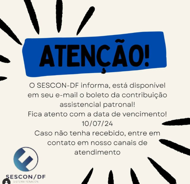 O SESCON-DF informa que já gerou e enviou, para os respectivos endereços de e-mail cadastrados, o boleto referente à 2ª remessa da taxa assistencial patronal, com vencimento para o dia 10/07/2024, conforme acordado na CCT-2024. Para qualquer dúvida, entre em contato com o SESCON-DF por telefone ou WhatsApp. Telefone de contato do SESCON-DF: (61) 3226-1269…