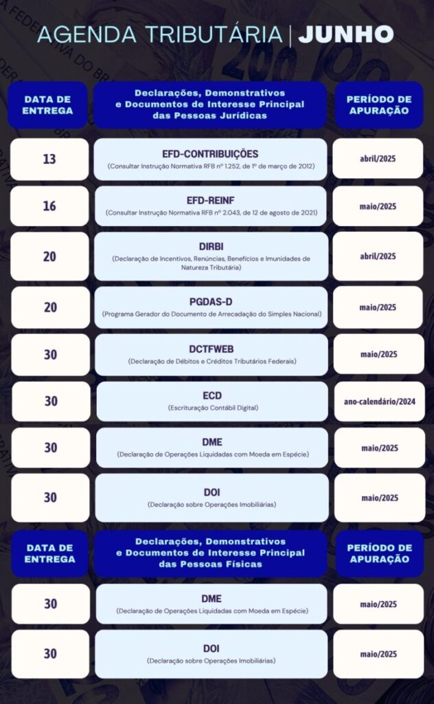 Confira as entregas do mês de junho e atente-se aos prazos! camis-admin 11 meses atrás Não deixe para a última hora! Compartilhe isso: Compartilhar no Facebook(abre em nova janela) Facebook Compartilhar no WhatsApp(abre em nova janela) WhatsApp Agenda Tributária setembro/2025: confira os prazosData1 de setembro de 2025Em relação aNotíciasAgenda Tributária julho/2025: confira os prazosData1 de julho de 2025Em relação aNotíciasReceita prorroga prazos tributários para municípios de MG atingidos por chuvasData4 de março de 2026Em relação aNotícias
