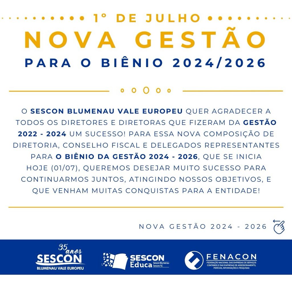 O Sescon Blumenau Vale Europeu quer agradecer a todos os diretores e diretoras que fizeram da gestão 2022 – 2024 um sucesso! Para essa nova composição de diretoria, conselho fiscal e delegados representantes para o biênio da gestão 2024 – 2026, que se iniciou nesta segunda (01/07), queremos desejar muito sucesso para continuarmos juntos, atingindo nossos objetivos, e que venham muitas conquistas para a entidade!