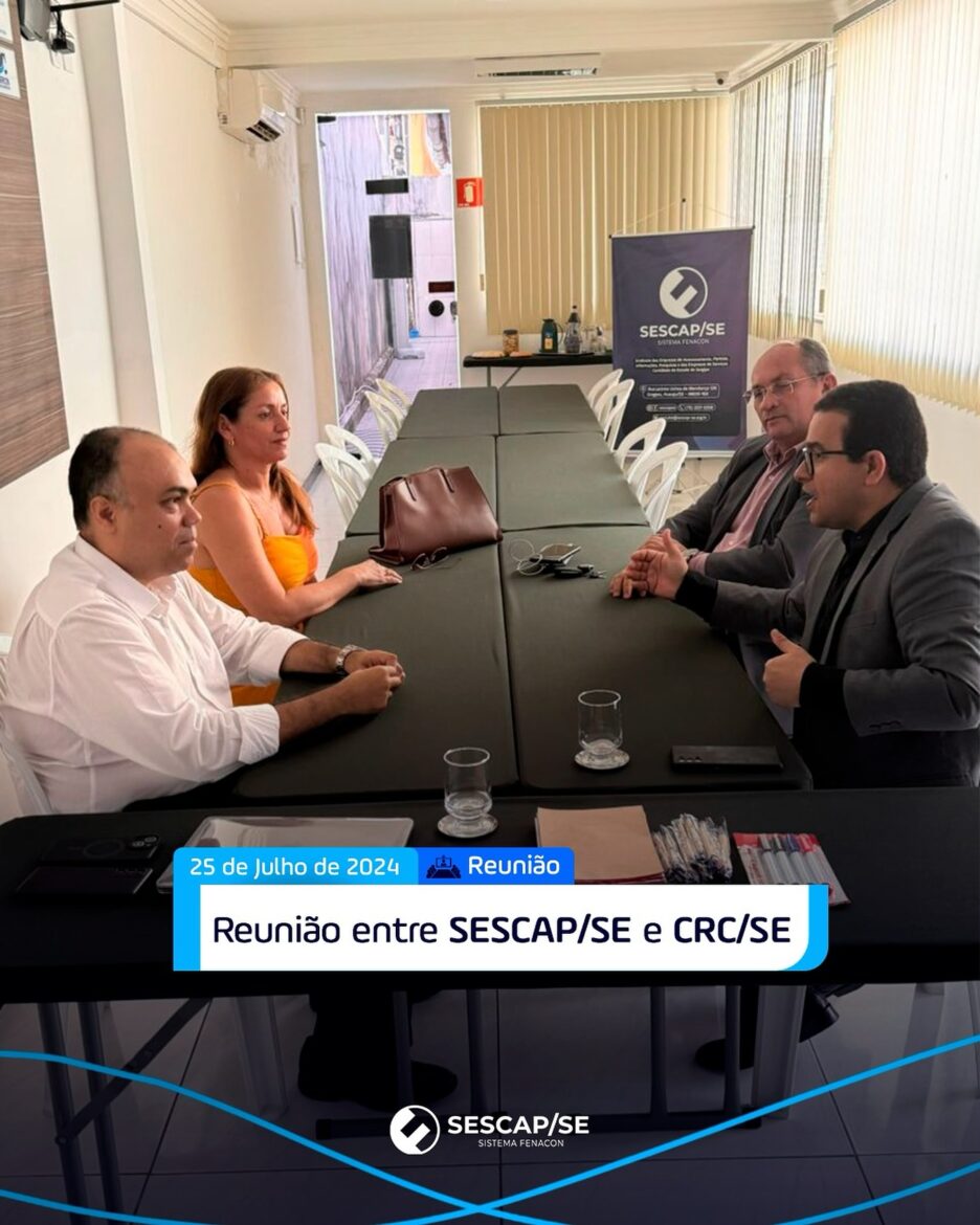 Na tarde da última quinta-feira, dia 25 de julho, o Presidente do Sindicato das Empresas de Serviços Contábeis de Sergipe (SESCAP/SE), Sr. Francinaldo Rodrigues, acompanhado pela Vice-Presidente, Sra. Edvânia Alves, reuniu-se com o Presidente do Conselho Regional de Contabilidade de Sergipe (CRC/SE), Sr. Ionas Mariano, e o Vice-Presidente de Desenvolvimento Profissional, Sr. Jenilton Gomes. O encontro teve como objetivo principal a discussão e o alinhamento das ações institucionais entre as duas entidades.