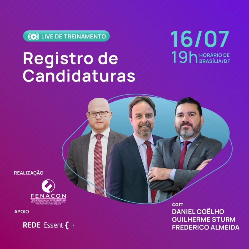 Junte-se a nós para uma conversa imperdível com Daniel Coêlho (Presidente da FENACON) e os especialistas em contabilidade e direito eleitoral Guilherme Sturm (CEO da Rede Essent Jus) e o Professor Frederico Almeida.