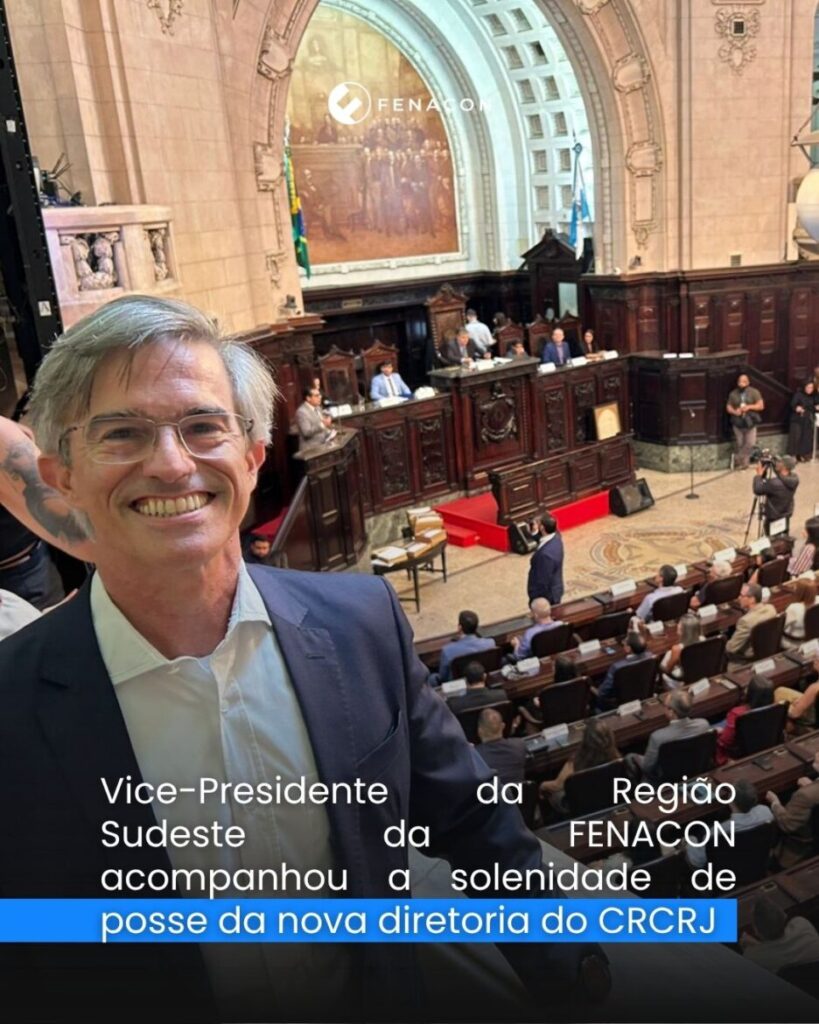 Na quinta-feira (16), o vice-presidente da FENACON Região Sudeste, Guilherme Tostes, prestigiou a solenidade de posse da nova diretoria do CRCRJ, no Rio de Janeiro. A entidade será presidida novamente pelo contador Rafael da Silva Machado no biênio 2026/2027.