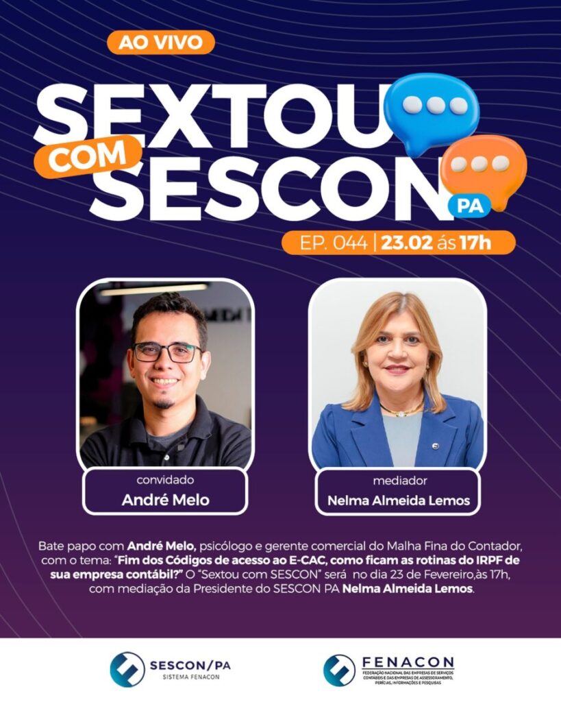 No “Sextou com SESCON” dessa semana, teremos como convidado André Melo, psicólogo e gerente comercial do Malha Fina do Contador. Com o tema: Fim dos Códigos de acesso ao E-CAC, como ficam as rotinas do IRPF da empresa contábil?. Teremos a mediação da Presidente do SESCON PA, Nelma Almeida Lemos.