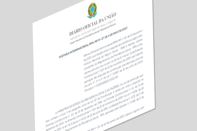 Foi publicada no dia 08/05/2023 a Portaria Interministerial MPS/MF nº 27, de 04/05/2023, do Ministério da Previdência Social e do Ministério da Fazenda, que atualiza a tabela de faixas para atribuição de alíquotas previdenciárias, bem como limite de salários de contribuição ao INSS, com base no novo salário mínimo nacional de R$ 1.320,00, válido a partir do dia 01/05/2023.