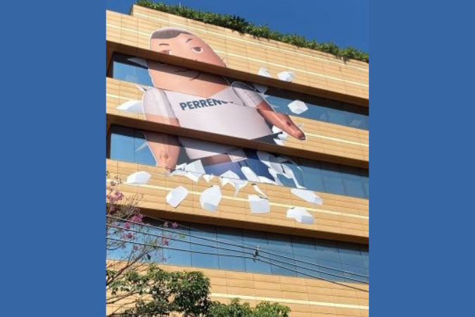 O adesivo do prédio traz o personagem com ar “canastrão” e representa a “ausência” e substitui o empreendedor em momentos importantes de sua vida. No interior do escritório, os seis andares foram personalizados com inspiração no jogo.