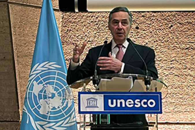 O ministro Luís Roberto Barroso fez palestra para embaixadores de diversos países ao lado do diretor-adjunto da Unesco, Tawfik Jelassi.