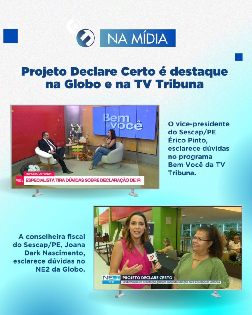 Já a Conselheira Fiscal do SESCAP/PE, Joana Dark Nascimento, participou do NE2, da TV Globo, reforçando a importância da orientação contábil para um preenchimento correto e seguro da declaração.