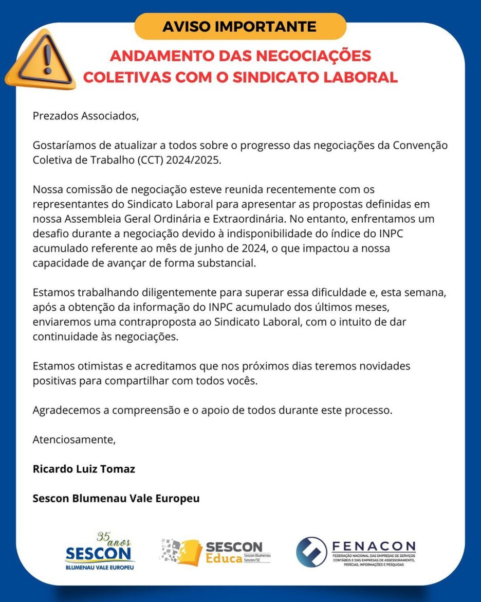 Gostaríamos de atualizar a todos sobre o progresso das negociações da Convenção Coletiva de Trabalho (CCT) 2024/2025.