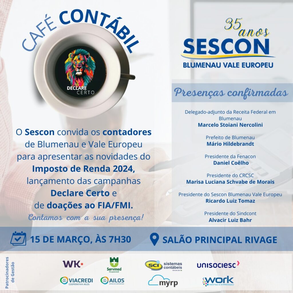 O Sescon Blumenau Vale Europeu promoverá seu tradicional café contábil voltado para os profissionais, autoridades e imprensa, no dia 15 de março, a partir das 7h30, do auditório da Rivage (na rua 25 de Julho, 907 – Itoupava Norte), em Blumenau.