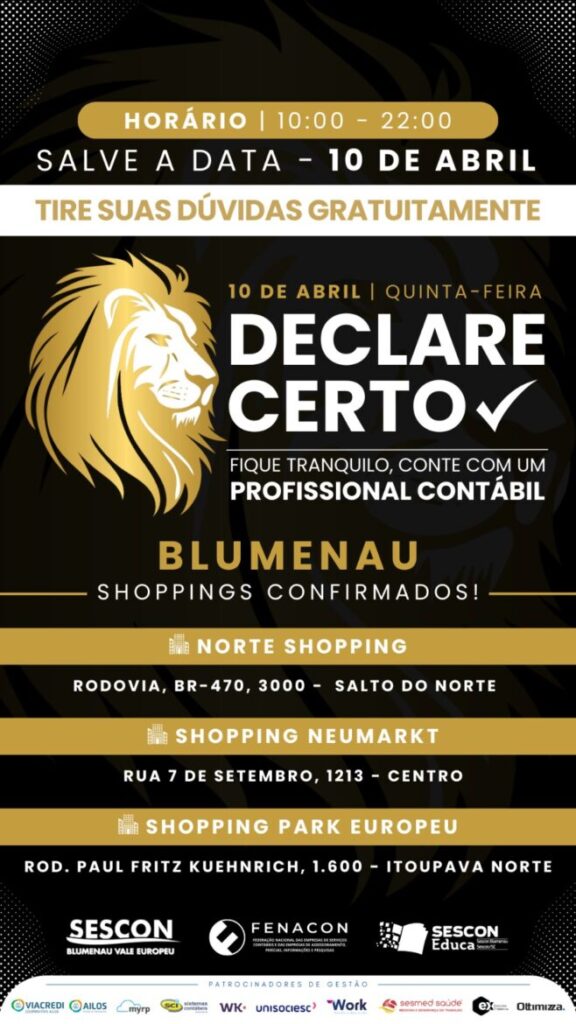 Durante o Dia D “Declare Certo”, contadores experientes estarão disponíveis nos principais shoppings de Blumenau para resolver dúvidas sobre a declaração do Imposto de Renda, de maneira gratuita. Esta iniciativa não só facilita o cumprimento das responsabilidades fiscais, mas também promove a conscientização sobre a importância de destinar parte do imposto devido aos Fundos da Infância e Adolescência (FIA) e ao Fundo Municipal do Idoso (FMI).