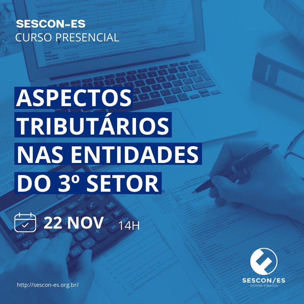 No dia 22 de novembro , às 14H, o SESCON-ES promove o curso presencial “ Aspectos Tributários nas entidades do 3º setor”.