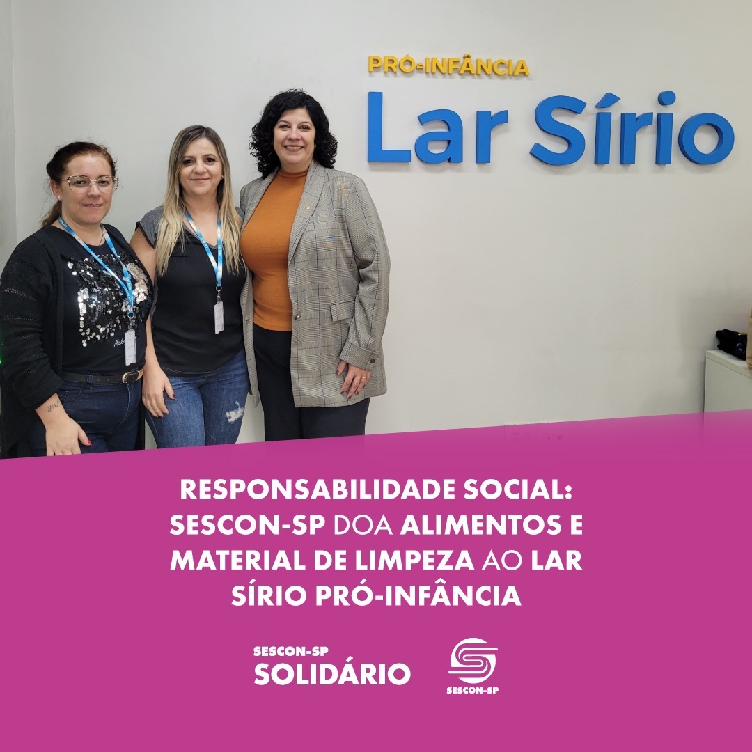 Nesta quinta-feira, 16 de maio, a diretora da Aescon-SP e coordenadora da Comissão de Responsabilidade Social, Fátima Macedo, realizou a entrega de alimentos não perecíveis e itens de limpeza ao Lar Sírio Pró-Infância. A centenária instituição, dedicada à promoção da cidadania e ao combate às desigualdades, acolhe, acompanha e desenvolve crianças e adolescentes em situação de vulnerabilidade social.